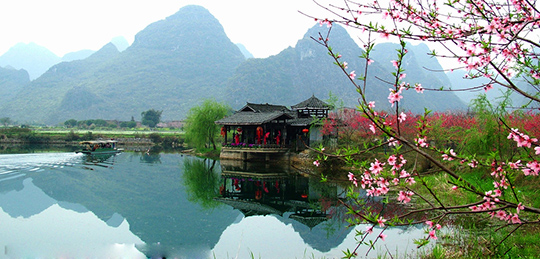 世外桃源 “世外桃源”位于阳朔县的白沙镇附近,主要由荷花池、燕子湖、燕子洞、侗乡风情和原始部落组成。若是“沾衣欲湿杏花雨,吹面不寒杨柳风”的季节,踏进“世外桃源”,展现在眼前的将是一片秀美的山水田园风光。景点: 世外桃源景区是国家AAAA级景区和世界旅游组织首推旅游目的地。 原始古朴的山间野趣,清雅自然的溪涧田园,山环水绕的岩溶地貌,造物主给了这块乐土最佳的组合,燕子湖在深情地歌唱,笔架山在默默地沉思,幽深的山洞之外是古老的村寨,古老的村寨旁边是桃花盛开的地方。 这里蕴藏了中国传统文化中的修身养性和隐逸休闲的特殊意境,从湖畔蛙声到草屋笛鸣,从渔歌唱晚到芦笙踩堂,从风雨长廊到渊明山庄,一切都浑然天成。